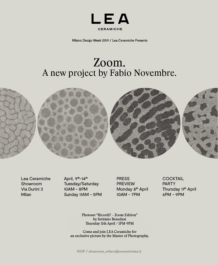 For the 2019 edition of the Fuorisalone, Lea Ceramiche presents Zoom, a new line of ceramic surfaces designed by Fabio Novembre that enriches and expands the decorative sign of the Concreto collection.