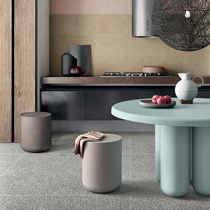 The latest solutions offered by Lea Ceramiche, which perfectly combine design and protection, include Masterpiece, the new collection designed by architect Ferruccio Laviani. The combination and breakdown of two tactile surfaces, concrete (Master) and Seminato (Piece), results in a new visionary and highly nuanced collection that offers a ceramic alphabet for composing sophisticated design masterpieces.