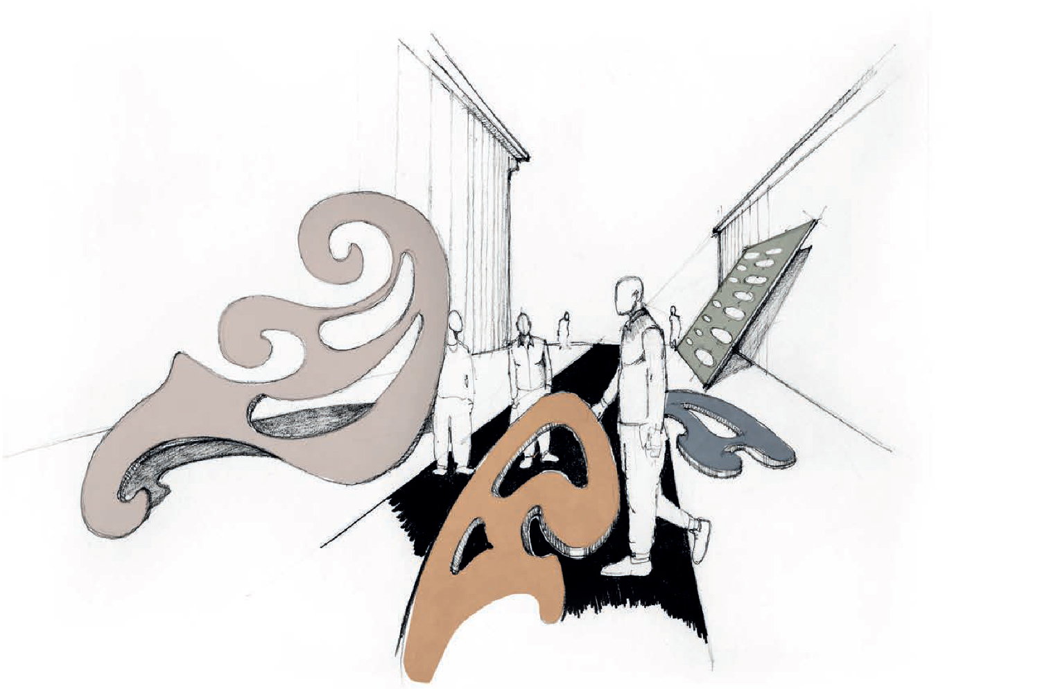 “There are objects from the not-so-distant 'analogue' era, which are still able to convey the manual skill involved in a certain design technique. ‘Tools and Space’ celebrates, in the surrealist manner of Savinio in 'Giochi Nella Foresta' [Games in the Forest], an era in which the tools of a recent past (circle templates, curved lines, or rulers) were required for design and architecture.