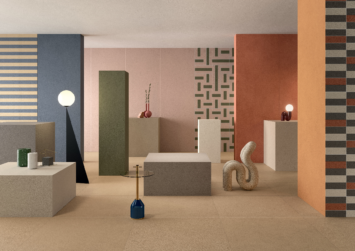 This installation, and specifically Lea Ceramiche's Pigmenti collection, also becomes an expressive tool for generating new shapes and volumes that recall surrealist monuments in an ideal De Chirico Italian piazza, suspended between the Neoclassical architecture of Palazzo Reale and that of Ignazio Gardella's PAC"