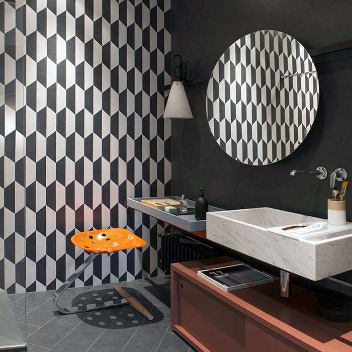 "Consider the bathroom to be a dynamic, flexible place that can be customised in many different ways. […] Inside my bathroom, dynamism is expressed through a system that makes it possible to move accessories and lamps over a metal structure, while two-tone patterned tiles cover the room’s rear wall, becoming a powerful customization element.”