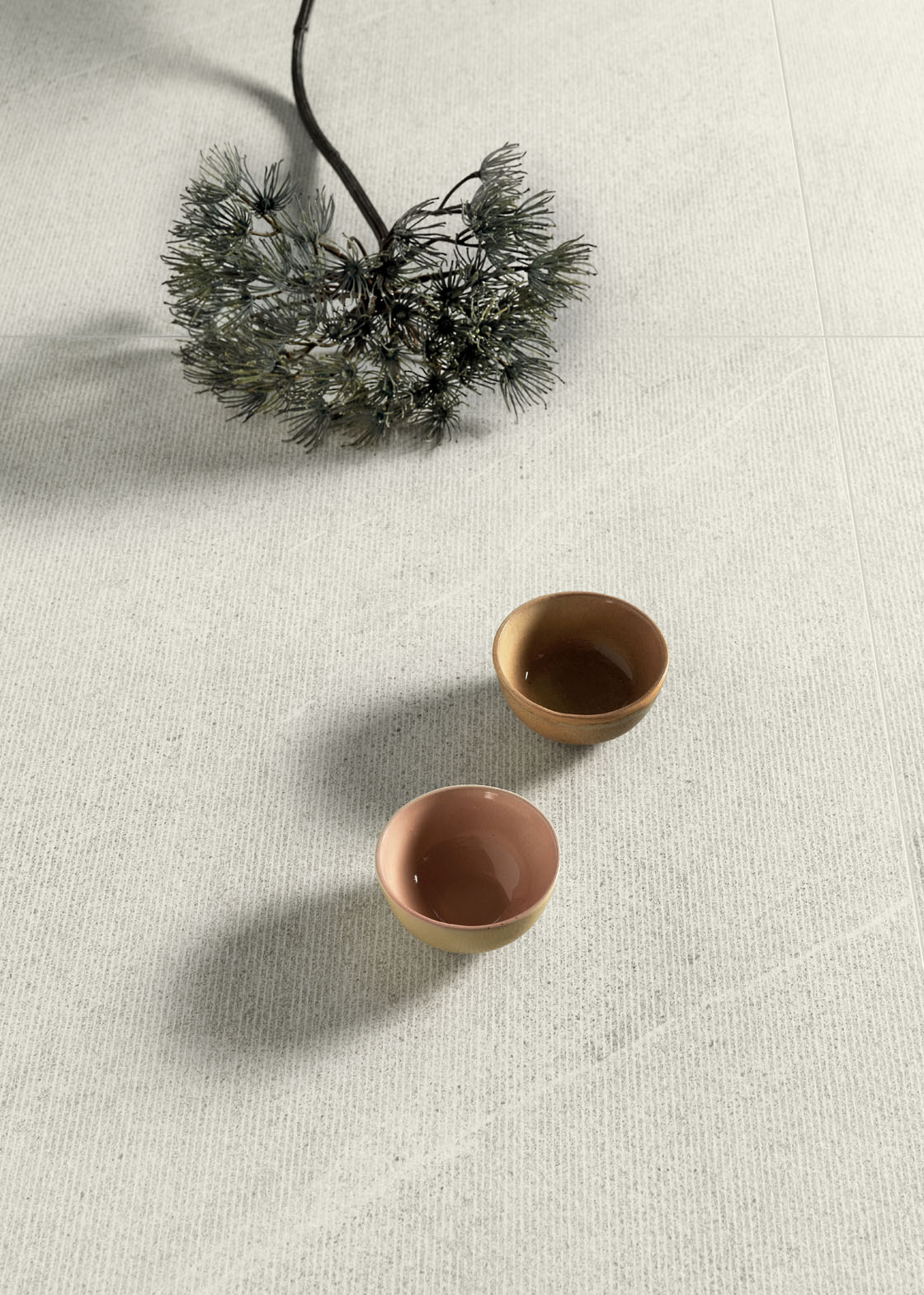 A decorative style is present in the collection and is expressed in three contemporary textures: Line, Dot and Mark re-create lightweight effects that can be combined with natural and honed finishes of the base modules, to create flowing, coordinated environments.