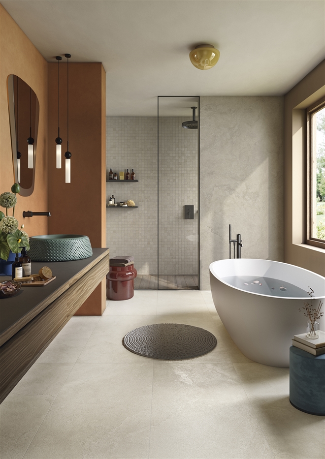 The colour palette, balanced and sophisticated, ranges from warm and enveloping tones to neutral and luminous shades, ensuring expressive surfaces in the classic hues of the stone effect.
