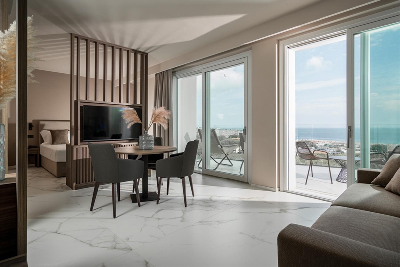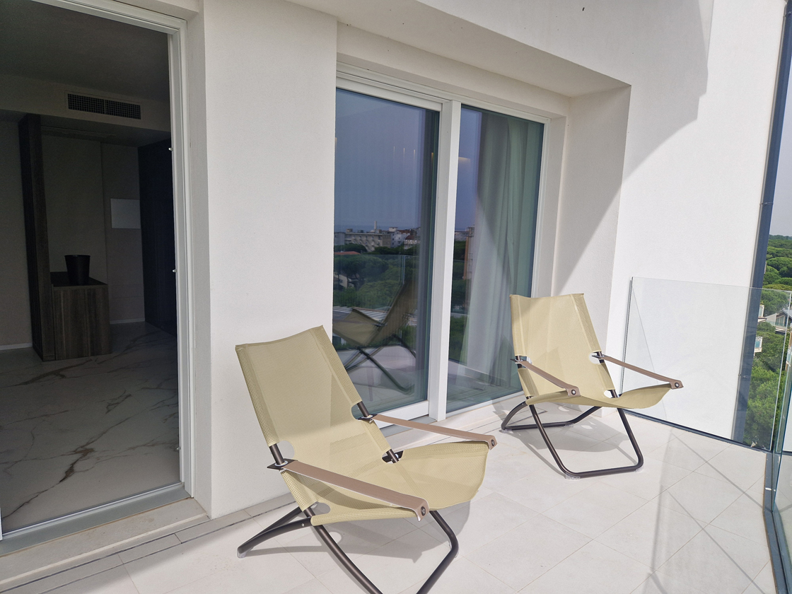 Fluid lines, curvilinear balconies and large glazed surfaces shape an architecture of solids and voids, where material and transparency meet in a refined balance. The building, arranged over nine floors, houses 37 rooms and four suites, culminating in a panoramic spa overlooking the horizon at 360°, where light becomes material and creates spaces of balance, well-being and silence.