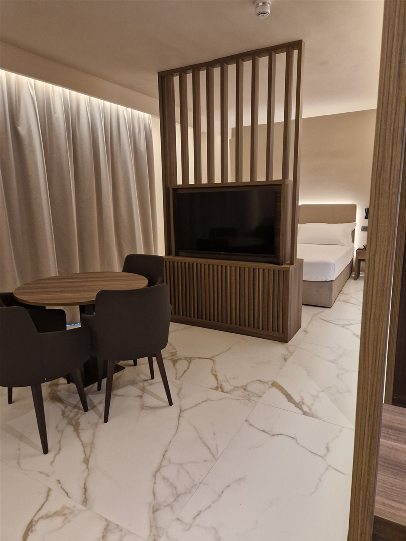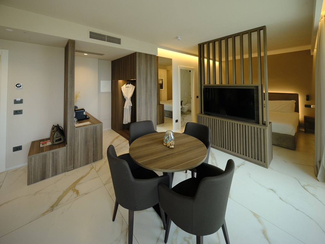 The balconies of the suites, on the other hand, are finished with the Masterpiece – Master White natural collection, completing the ensemble with an essential and contemporary tone, in harmony with the sinuous lines of the façades. In every environment, the Lea Ceramiche surfaces become an integral part of the architecture: a dialogue between design and technology that transforms the space into an experience of timeless well-being and beauty.