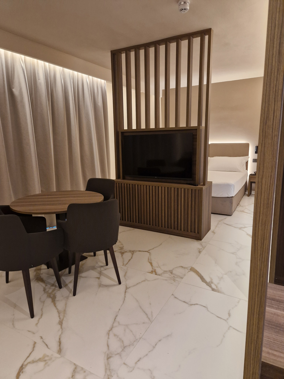 The Lea Ceramiche surfaces define the material and sensory character of the project, accompanying each environment with textures and finishes chosen to express elegance, coherence and comfort. Indoors, the suites and bathrooms feature the Noblesse – Calacatta Oro collection, used in the natural version for floors and the polished version for wall coverings: a luminous and sophisticated ceramic marble that amplifies the perception of space and the quality of light.