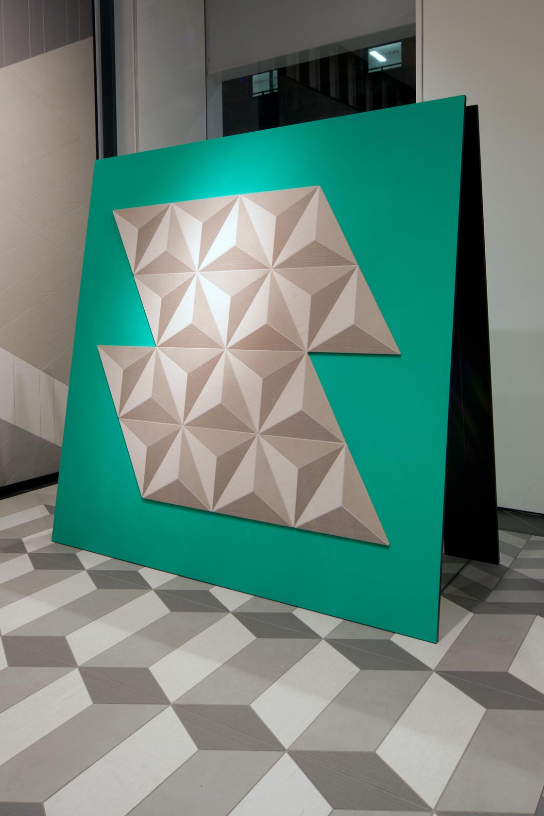 Exploring the numerous combinations of format, colour, and finish, the collection winds its way along the walls, the floors, and the triangular totems, subdividing the perimeter of the space and highlighting Trame’s unique characteristic: the chance to have continuous surfaces with decorative elements not only on the walls, but on the floor as well.