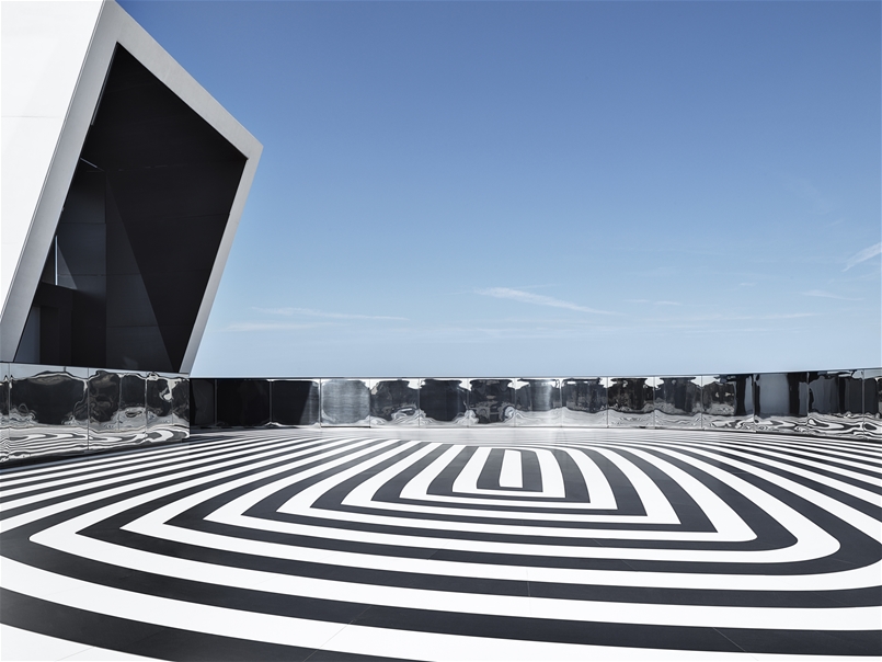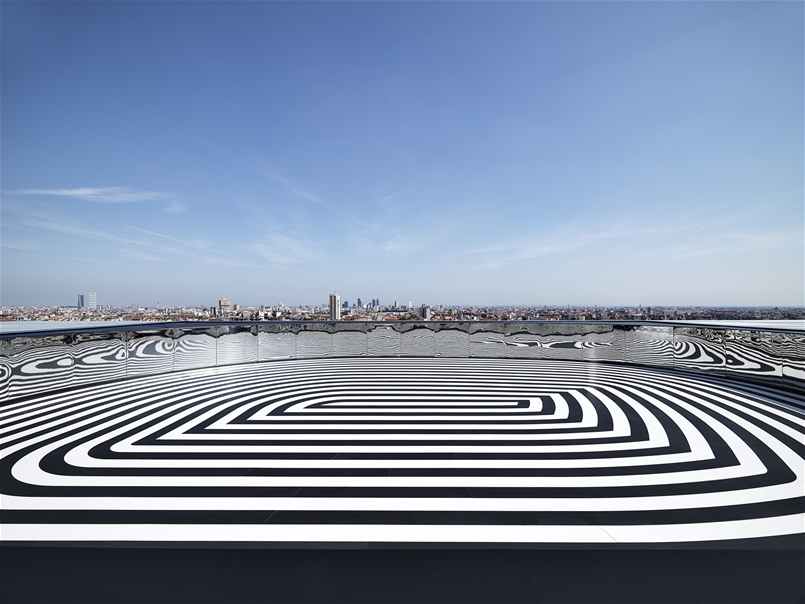 The flooring features an optical illusion in black and white, made using tiles from Lea Ceramiche’s Absolute collection. The design is made up of a sequence of rectangular tiles in Slimtech porcelain stoneware which have been cut to measure and arranged according to a set geometric pattern. As a result, the surface seems bigger, while the mirrors used around the edges of the terrace erase the barrier between the rooftop space and the stunning 360° views of the city. The minimalism and purity of the materials – which feature just two dominant colours – and the unique laying pattern create attractive, subtle curves on the surface, delivering a high-impact aesthetic punch to the terrace.