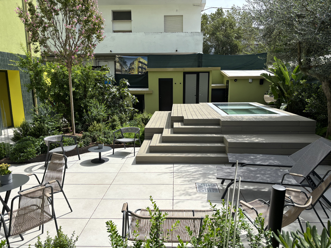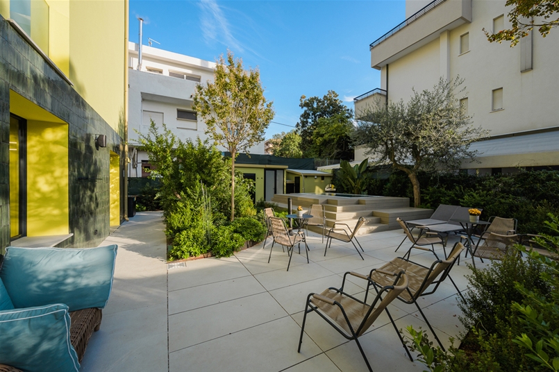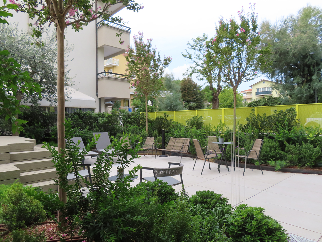 Inside the MODE Eco Mood Hotel in Rimini, a project that experiments with new models of sustainable hospitality through the contribution of several Italian architecture firms, outdoor spaces represent a fundamental component of the hotel’s identity. Conceived as places for meeting and relating with the landscape, they define a natural continuity between architecture, greenery and well-being, transforming the outdoor area into a living and welcoming extension of the stay experience.