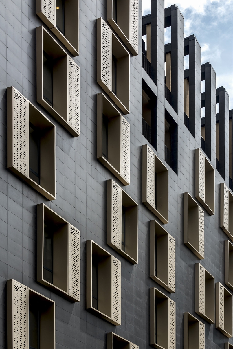 With the aim of combining two different building cultures, the traditional Ethiopian building structure - core in reinforced concrete and hollow concrete blocks with mediocre thermal performance - was flanked by the ventilated facade covered with surfaces from the Slimtech Basaltina Stone Project Collection in a thickness of 3,5 mm, for a total of 5500 sqm. At the entrance and, to be precise, throughout the reception area, the District Collection in the traditional 9,5mm thickness, becomes a seamless element between exterior and interior, while the Woodstock e Type32 collections completely cover the eight floors of stairs of the building, for a total of 6200 sqm.