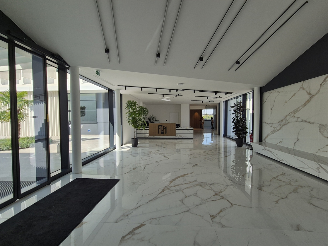 In the interior spaces dedicated to representation, the Calacatta Oro nuance from the Noblesse collection introduces a sophisticated and deeply expressive dimension.