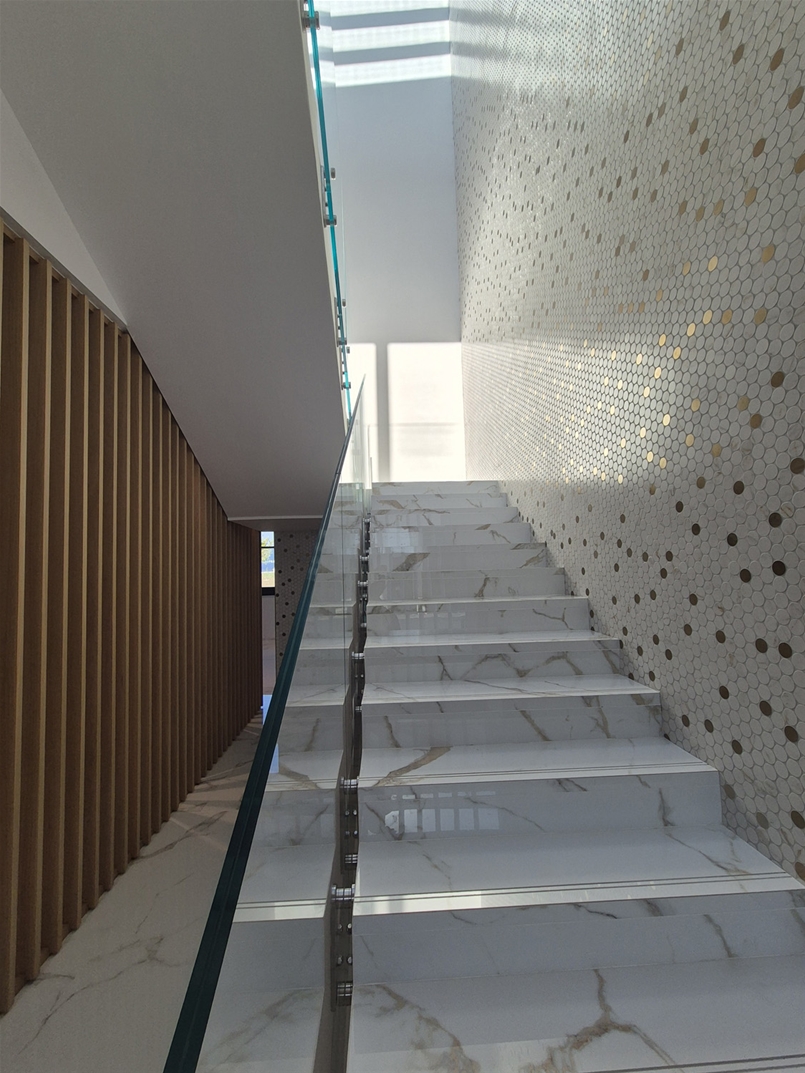 Large Slimtech ultra-thin slabs define walls, lounge areas and directional corridors with a luminous, elegant material presence, while the coordinated staircase elements contribute to building a coherent and distinctive architectural language.
