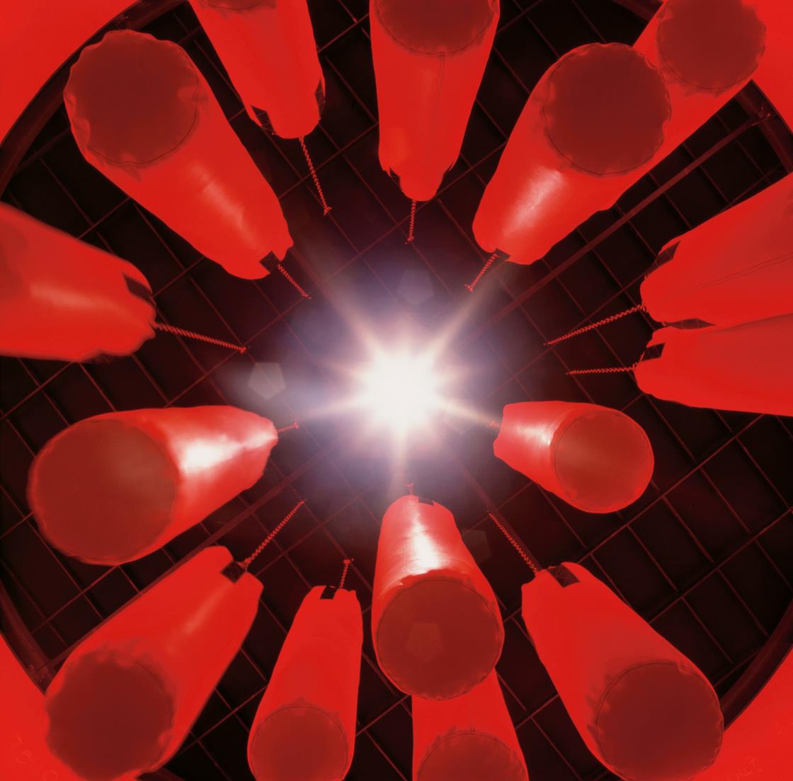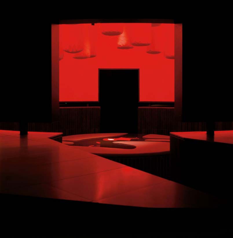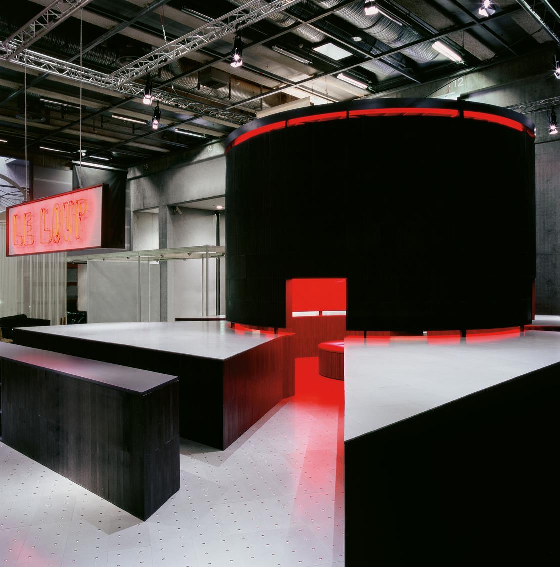The project evolves around a cylindrical body, a sort of great magic lantern which is accessible through radial paths, in which some of the more important images of the tale are represented. From the outside, the space does not give away its true identity. The visitor, shy and yet attracted by the reassuring and captivating red light, is violently thrust into the circular space where memories, allegories and emotions create an exciting euphoric atmosphere and the desire to put on a mask (loup) in order to metaphorically act out their own fairy tale. Inside the space, entirely covered in ceramic material, a large, circular sofa in which the wolf’s silhouette is inscribed, welcomes the visitors; a series of boxing bags in white leather hang above the audience, inviting them to enter the ring and begin the game. Le Loup represented another stop in the path upon which Lea Ceramiche has embarked to create projects and events with important architectonic content and cultural beliefs in the creative and planning strength, still not completely expressed, of ceramic material.