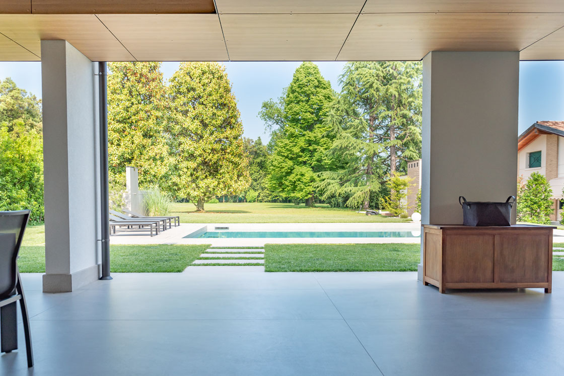 A contemporary home whose austere geometry and transparent elements contrast starkly with the lush greenery that surrounds them. A splendid villa, designed by architect Mariano Sessa, featuring large outdoor spaces dedicated to relaxation and socialising, on the windows of which the surrounding landscape is evocatively reflected.