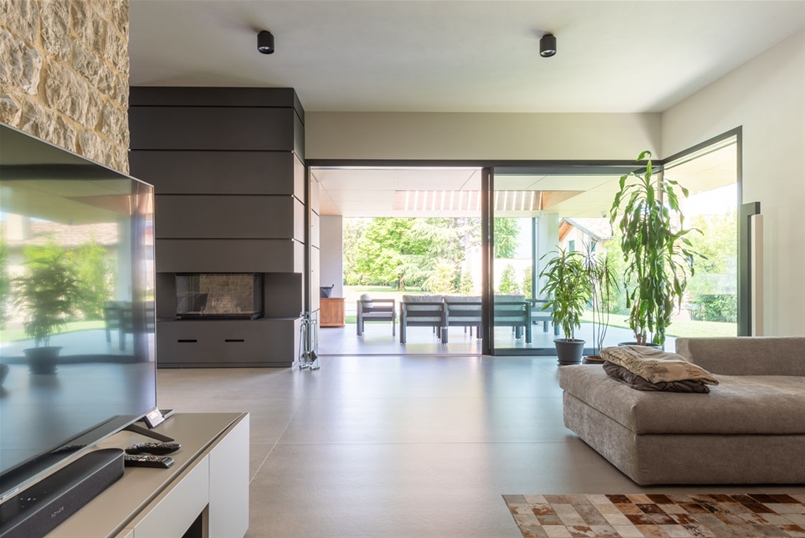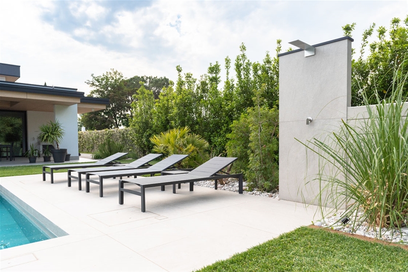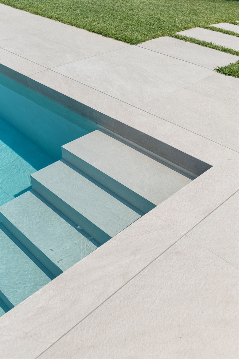 The Nextone collection, in its 260x120 cm format and with a thickness of 6 and 9 mm, was used for both the interior floors and wall coverings, while its 60x60 cm format, with a thickness of 20 mm, was used for the outdoor spaces. The Next Dark and Next Taupe nuances emphasise the relationship between the villa’s contemporary design and the surrounding natural landscape: the dark colours, in tasteful contrast with the light ones, exalt the architectural elegance of the design. The ultra-thin Slimtech slabs, with a thickness of just 6 mm, are lightweight, durable, and sustainable. Made using advanced production processes, they reduce the consumption of raw materials, energy, and water while limiting CO2 emissions. Furthermore, thanks to the THINk ZERO project, all remaining emissions are fully offset, resulting in a product with a zero-impact lifecycle.