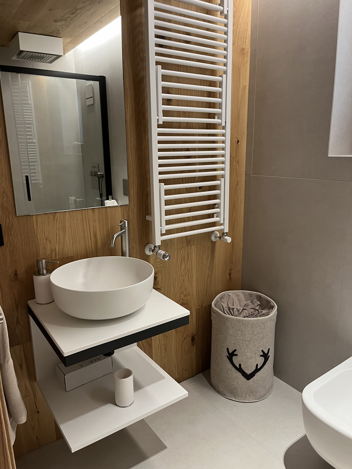 The architecture draws inspiration from high-altitude refuges and Walser settlements, but reinterprets them with an essential and contemporary language: large windows, wood and metal shape pure and luminous volumes, while the porcelain stoneware surfaces by Lea Ceramiche ensure aesthetics, resistance and safety in the most sensitive areas of contemporary living.