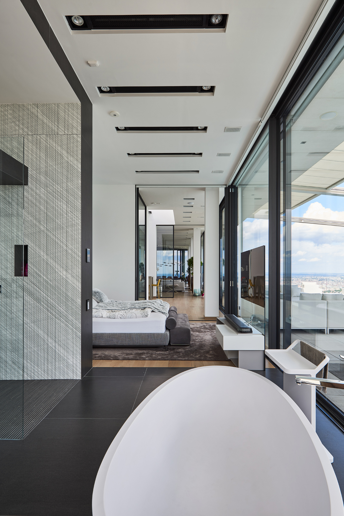 Design reigns supreme in the bathrooms and in the kitchen. Lea Ceramiche’s high-impact surfaces, which boast remarkable technical performance, are perfectly in line with the avant-garde design of this villa developed by the Hungarian Nara Studio. In some of the bathrooms, the elegance of Slimtech Absolute Total White tiles alternates with the optical wave effect of the Waves wall covering by Patrick Norguet. The bathrooms also include the Naive collection, another collaboration with the French designer that combines design and technology, craftsmanship and industry, porcelain stoneware and enamels for a graphic effect reminiscent of hand-drawn pencil lines. The 3.5 mm-thick Basaltina Stone Project collection was also used for the project, featuring a minimal and striking look inspired by natural stone. Finally, the kitchen is fitted with tiles from Diego Grandi City collection, whose metallic-effect texture is the result of extraordinary research into materials and technology, lending the room enormous charm.